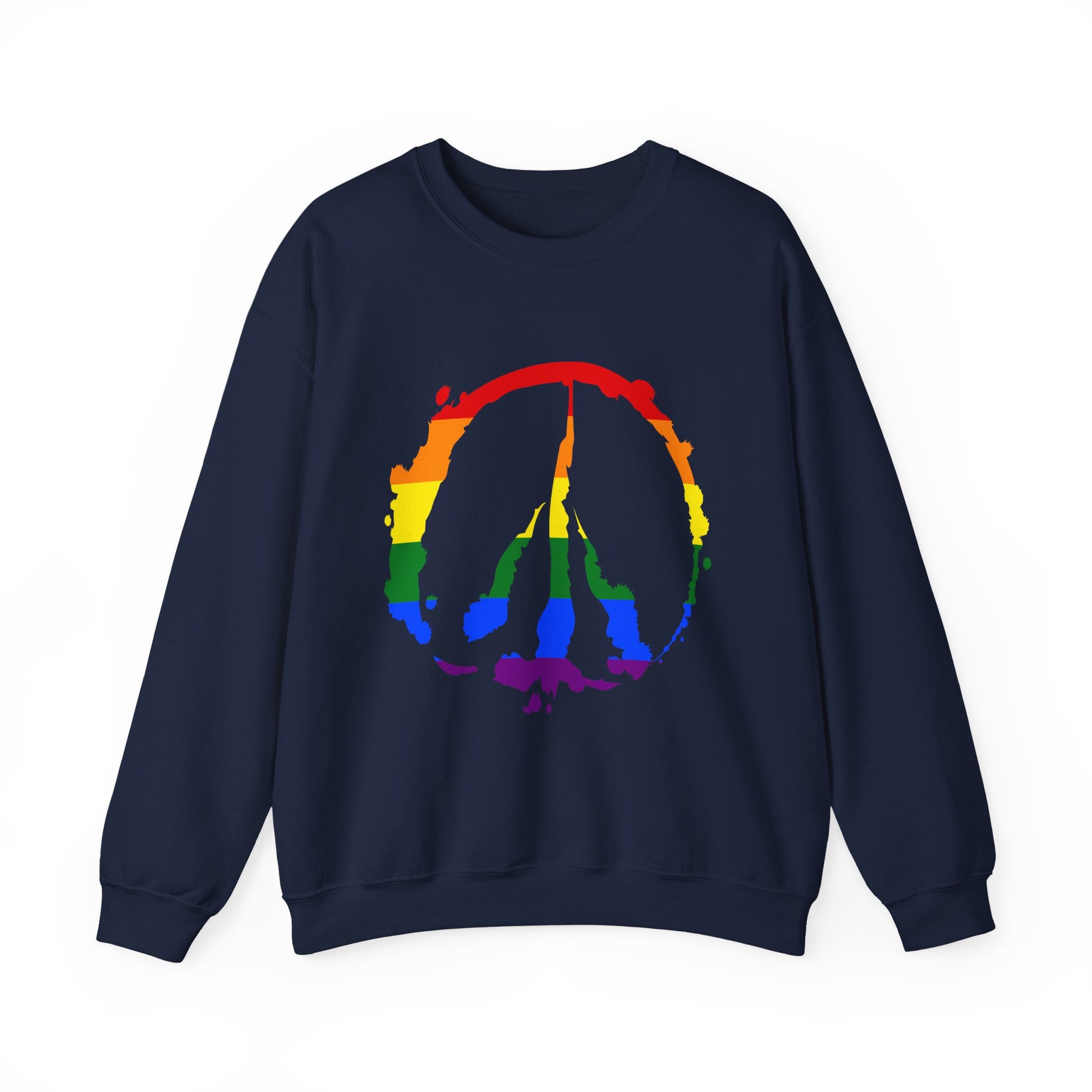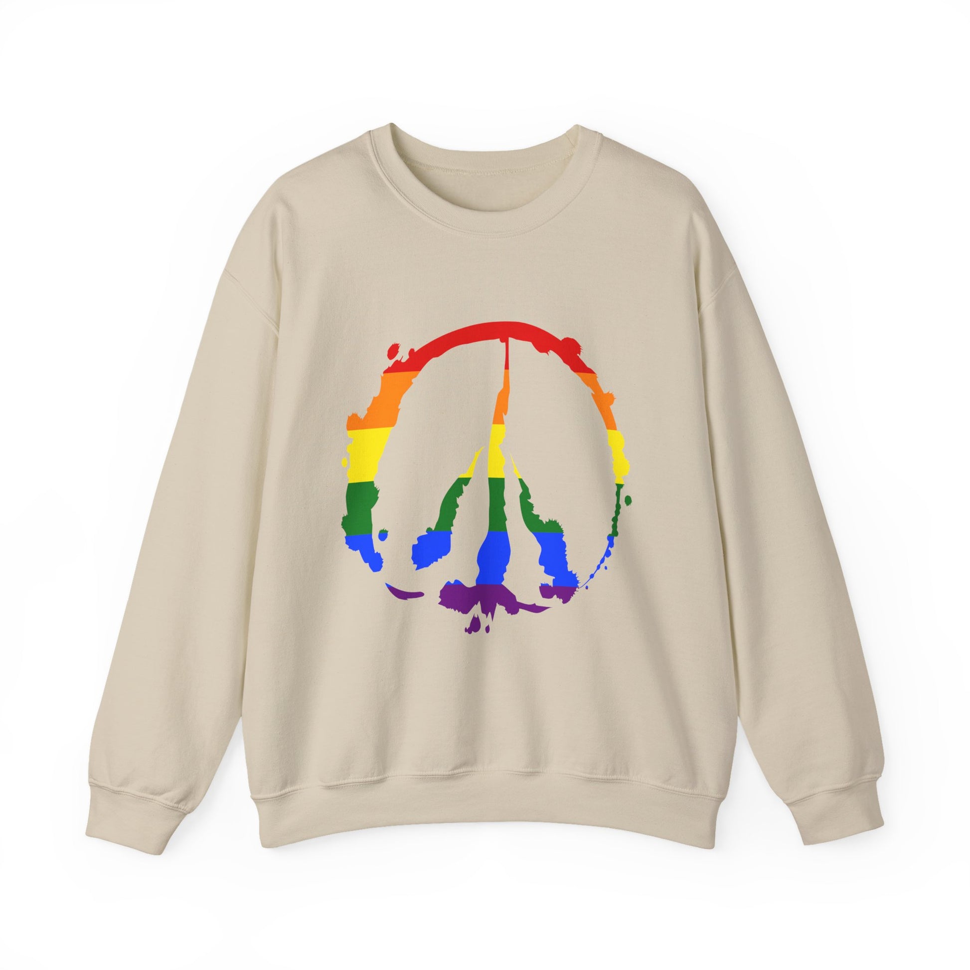Introducing this cozy Unisex Heavy Blend™ Crewneck Sweatshirt, designed to bring comfort and style to your wardrobe. With its soft fabric blend, this sweatshirt envelops you in warmth, perfect for chilly days or relaxed evenings at home. Its classic fit and clean-cut style make it versatile enough for casual outings or lounging around. Ideal for anyone who appreciates both comfort and aesthetic, this sweatshirt makes a thoughtful gift for friends and family on occasions like birthdays, holiday celebrations, or Pride Month. Dress it up or down—the vibrant peace symbol design adds a bold statement while promoting love and unity, making it great for festivals and gatherings. Embrace a laid-back vibe while showing your support for inclusivity and self-expression, truly representing the essence of community and positivity.